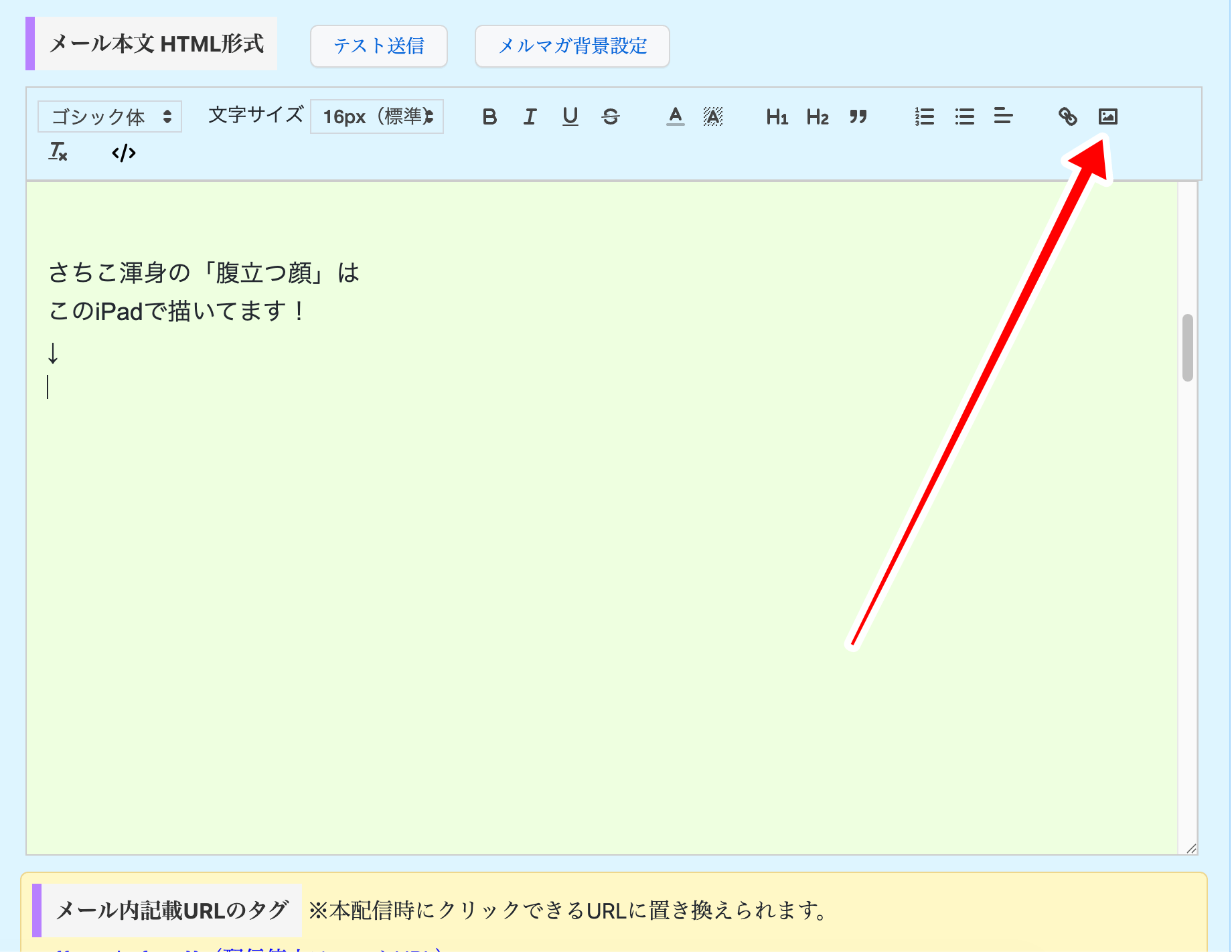メール作成画面の中にあるこの「画像ボタン」から画像のURLを挿入すると…